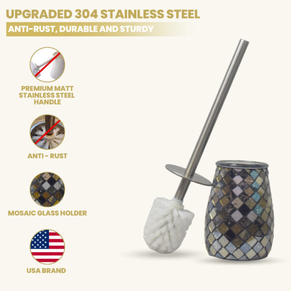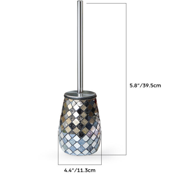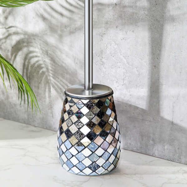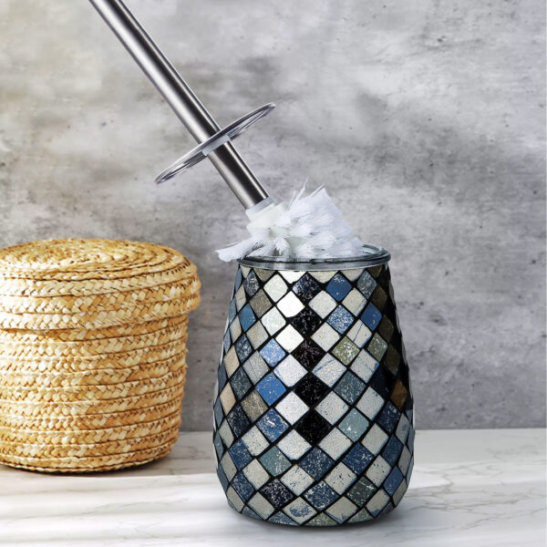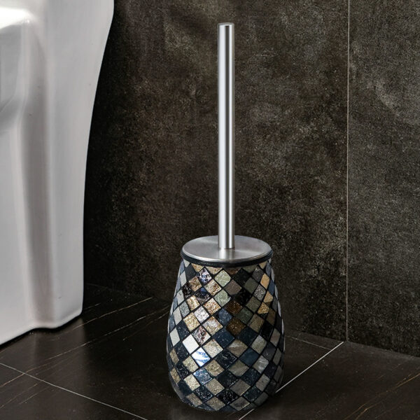 The Escenzy Black Gold Toilet Brush and Holder Set combines practical functionality with elegant design, offering a stylish solution for keeping your bathroom clean and organized. Here’s a closer look at the features and benefits of this set:### Elegant DesignThe black gold color scheme and mosaic glass design of this toilet brush and holder set add a touch of sophistication to any bathroom decor. The combination of black and gold accents creates a luxurious aesthetic that elevates the look of your bathroom, making it feel more refined and stylish.### Durable ConstructionConstructed from non-rustic stainless steel, this toilet brush and holder set is built to last. The stainless steel material is resistant to rust and corrosion, ensuring long-term durability and performance even in moist bathroom environments. This durability makes the set a practical investment that will withstand daily use for years to come.### Practical FunctionalityIn addition to its aesthetic appeal, this set offers practical functionality for keeping your bathroom clean. The toilet brush features sturdy bristles that effectively remove stains and grime from toilet surfaces, ensuring thorough cleaning with minimal effort. The holder provides a convenient storage solution, keeping the brush discreetly tucked away when not in use.### Easy MaintenanceMaintaining this toilet brush and holder set is simple and hassle-free. The stainless steel construction is easy to clean and sanitize, requiring only a quick wipe down with a damp cloth to remove dirt and debris. The non-porous glass mosaic surface is also easy to clean and resistant to staining, helping to maintain the set’s pristine appearance over time.### Versatile UseThe elegant design and neutral color palette of this set make it suitable for a variety of bathroom styles and color schemes. Whether your bathroom decor is modern, traditional, or eclectic, the black gold finish and mosaic glass accents complement a wide range of aesthetics, making this set a versatile addition to any bathroom.### Overall ImpressionThe Escenzy Black Gold Toilet Brush and Holder Set offers a combination of style, durability, and practicality, making it a valuable addition to any bathroom. With its elegant design, durable construction, and easy maintenance, this set provides both aesthetic appeal and functional use, helping to keep your bathroom clean and organized in style.### Key Points:- **Elegant Design**: Black gold finish and mosaic glass accents add sophistication to bathroom decor.- **Durable Construction**: Non-rustic stainless steel ensures long-term durability and performance.- **Practical Functionality**: Sturdy bristles effectively clean toilet surfaces, while the holder provides convenient storage.- **Easy Maintenance**: Stainless steel and glass surfaces are easy to clean and sanitize.- **Versatile Use**: Suitable for a variety of bathroom styles and color schemes.Upgrade your bathroom with the Escenzy Black Gold Toilet Brush and Holder Set and enjoy both style and functionality in one elegant package.