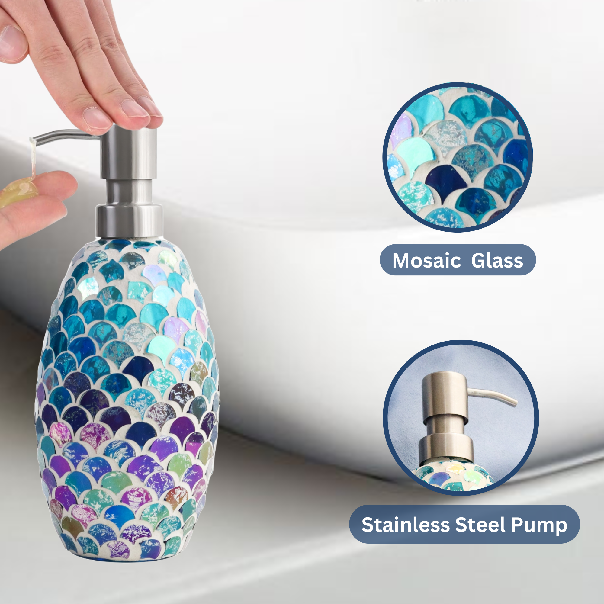 Luxurious Mosaic Mermaid Finish: Upgrade your bathroom counter set with this beautiful mosaic glass bathroom accessories collection, blending charm and high-end functionality.