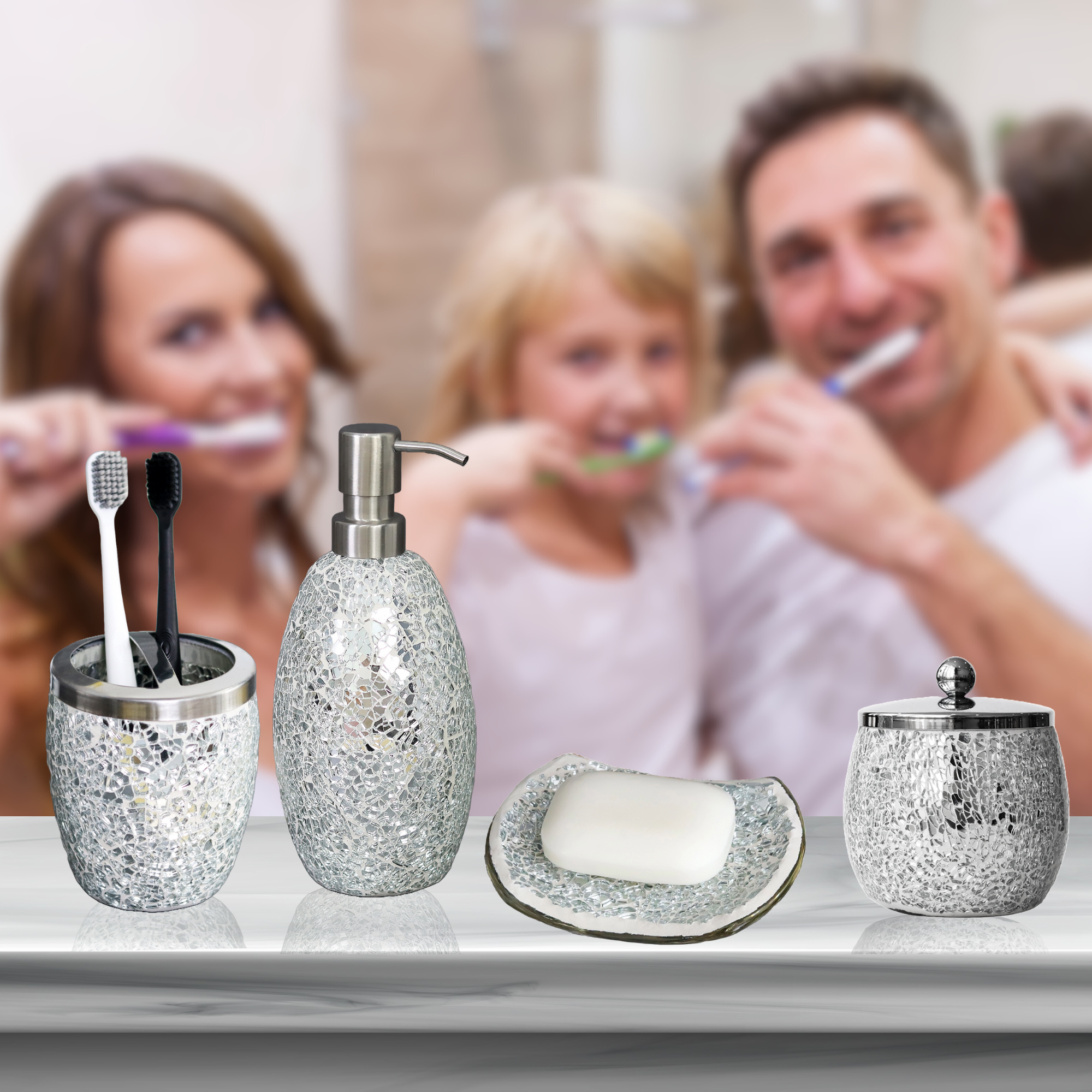 Sophisticated Silver Shine: Upgrade your bathroom counter set with this beautiful mosaic glass bathroom accessories collection, blending charm and high-end functionality.